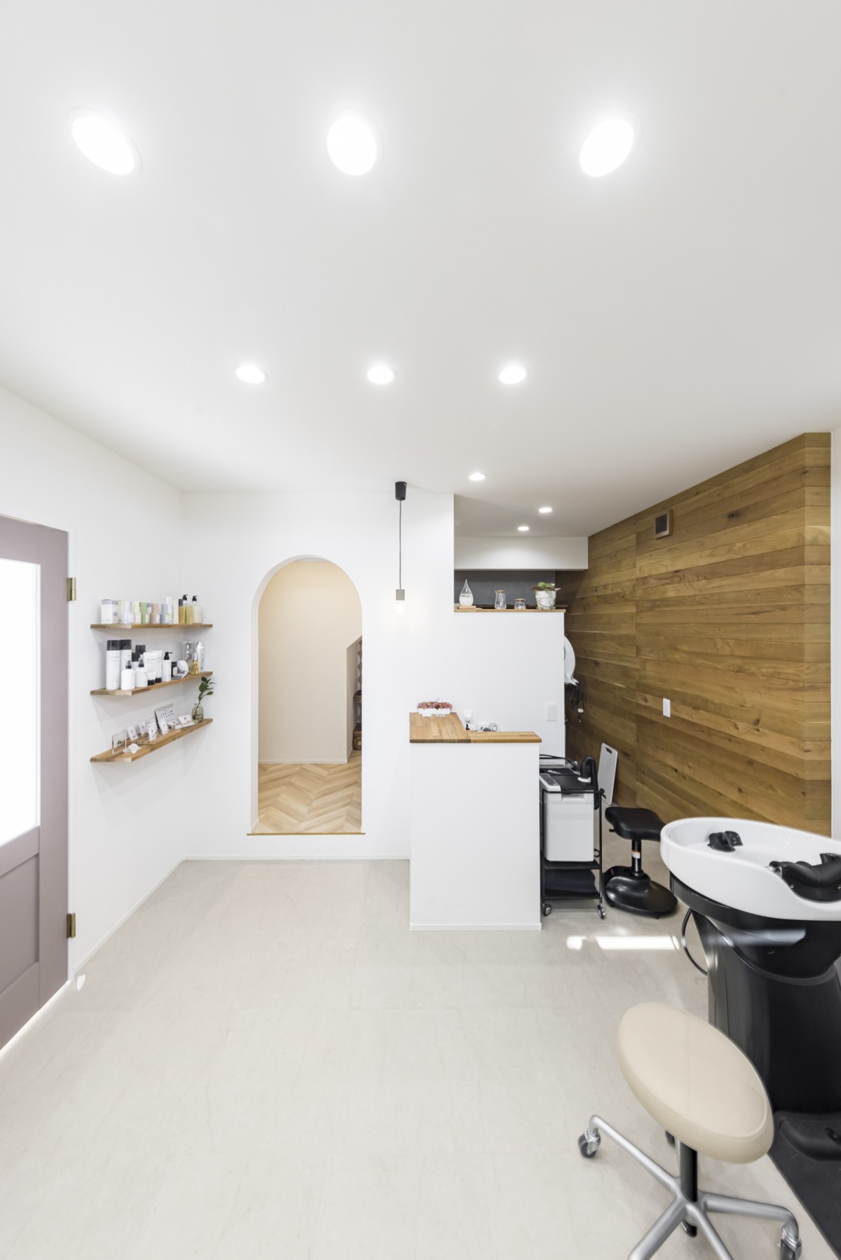 生活スペースと仕事場が繋がる、一体感のある住まい。アーチ開口を採用し、サロンの世界観をより魅力的に◎
