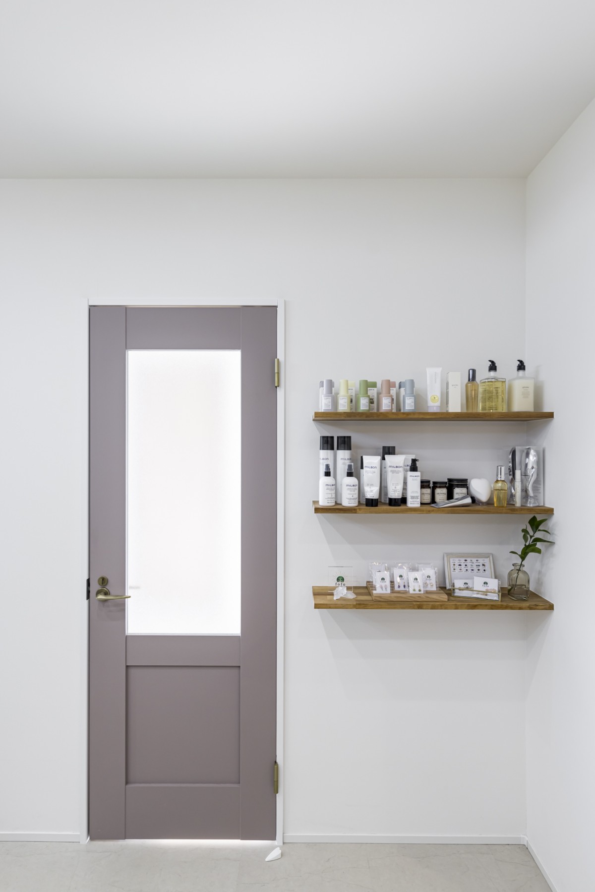 くすみがかったベージュの色が可愛らしいサロンドア。シンプルな構造は色にこだわってワンランクお洒落に。