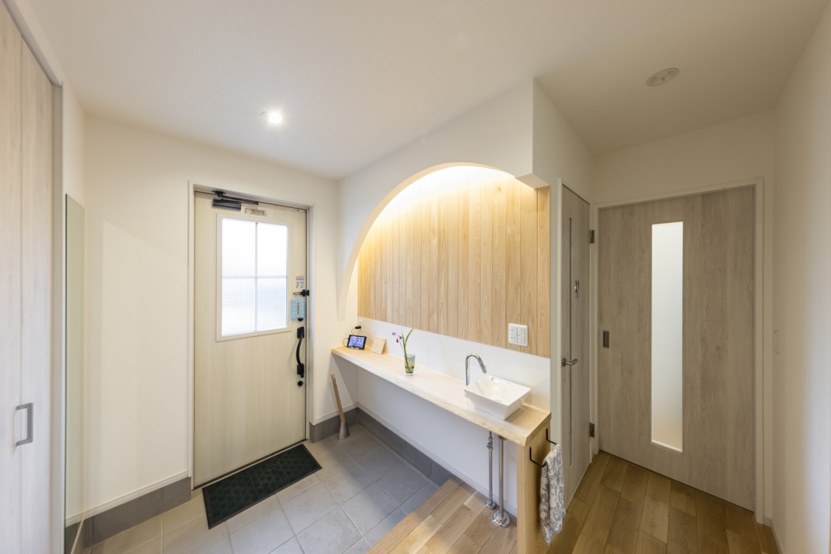 玄関に併設されている手洗い場。木の温もりとアーチ壁が柔らかい印象を与えます。
