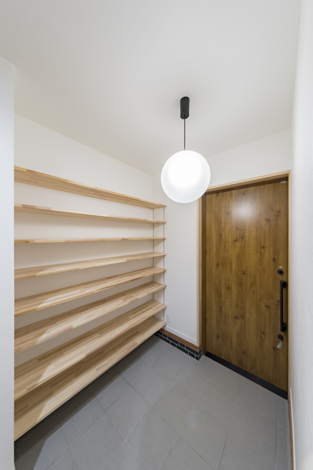 玄関入ってすぐの大容量シューズクローゼット。玄関も広く設計されており、ゆとりのあるスペースが魅力です。