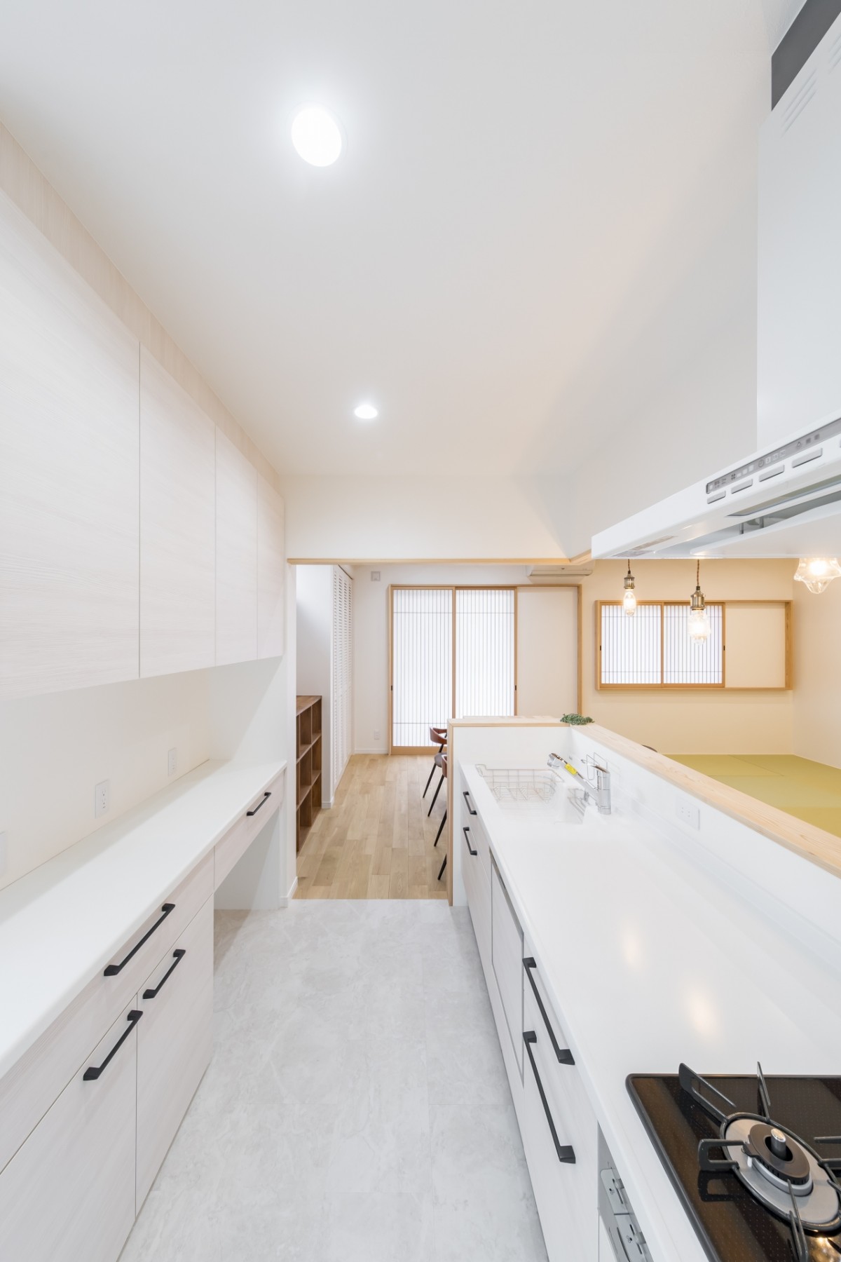 ホワイトを基調としたキッチンとカップボード。床の色もホワイト系に合わせることで広々とした空間になります。