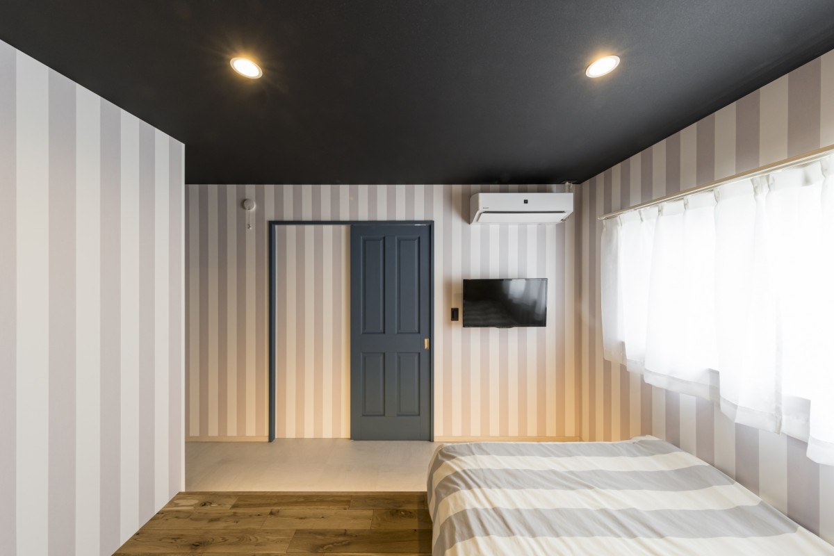 ブラックの天井は差し色となり寝室のアクセントにもなります。こだわりが垣間見える配色です。