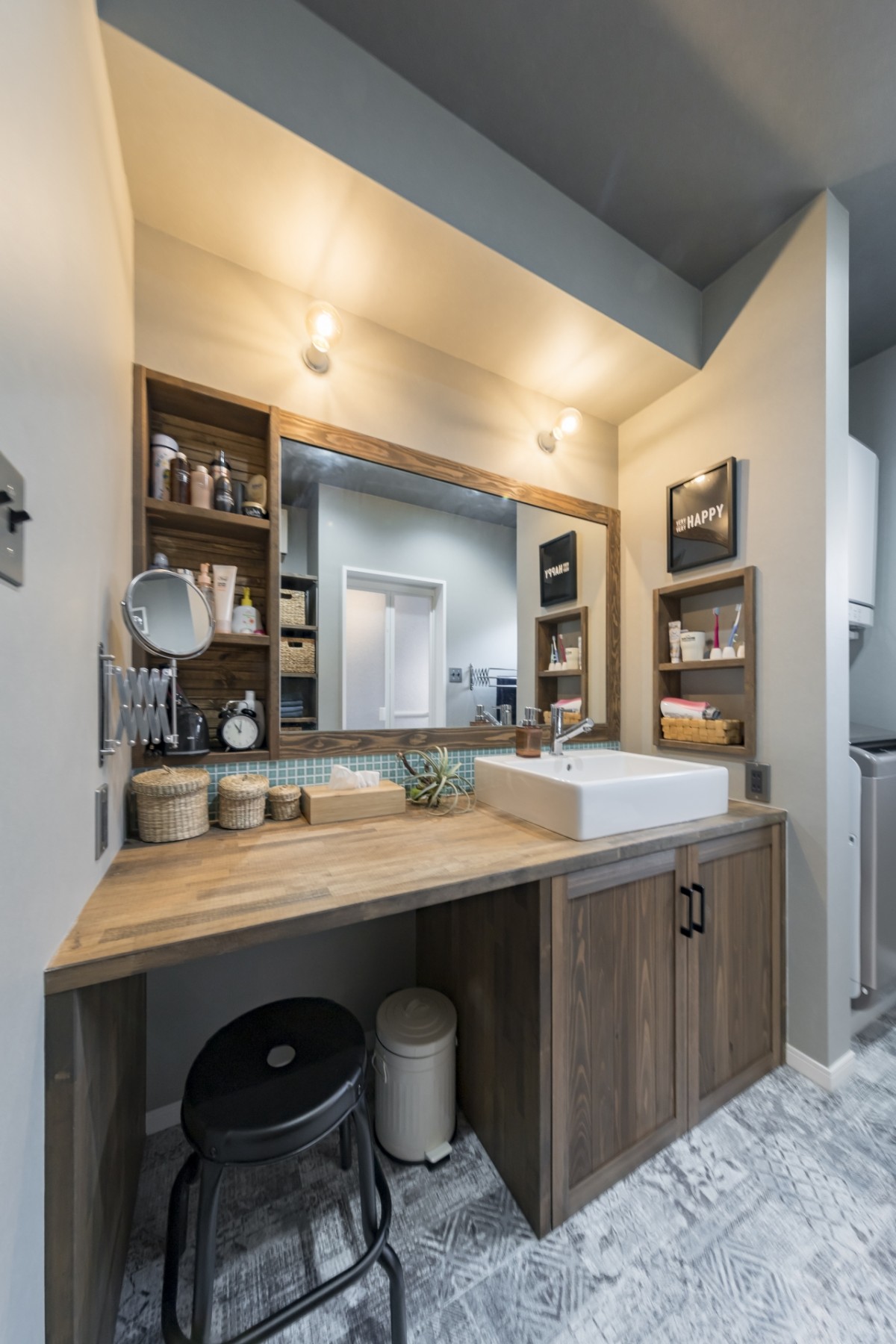 木を使った造作洗面台。ニッチ収納を設け、すっきり整った洗面スペース。