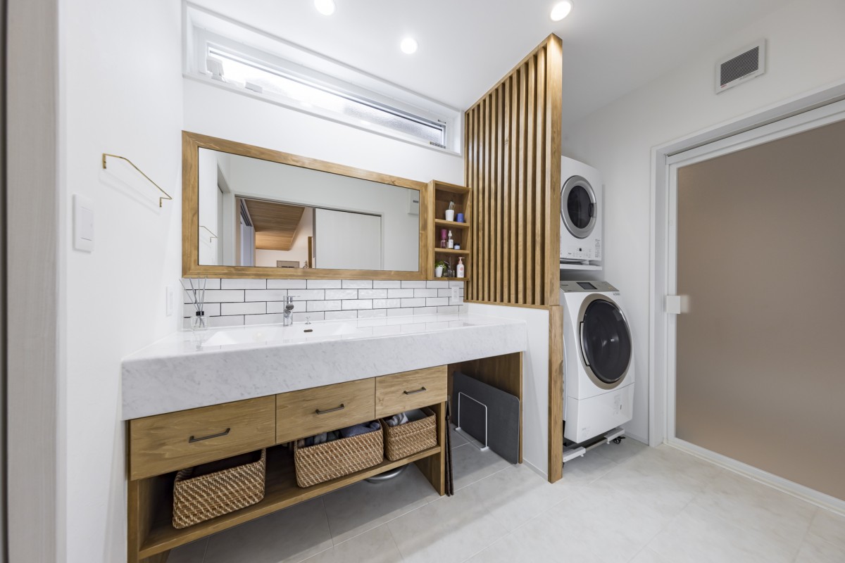 洗面台と洗濯機を仕切る木のパーテーションが、洗面台の雰囲気とマッチ。