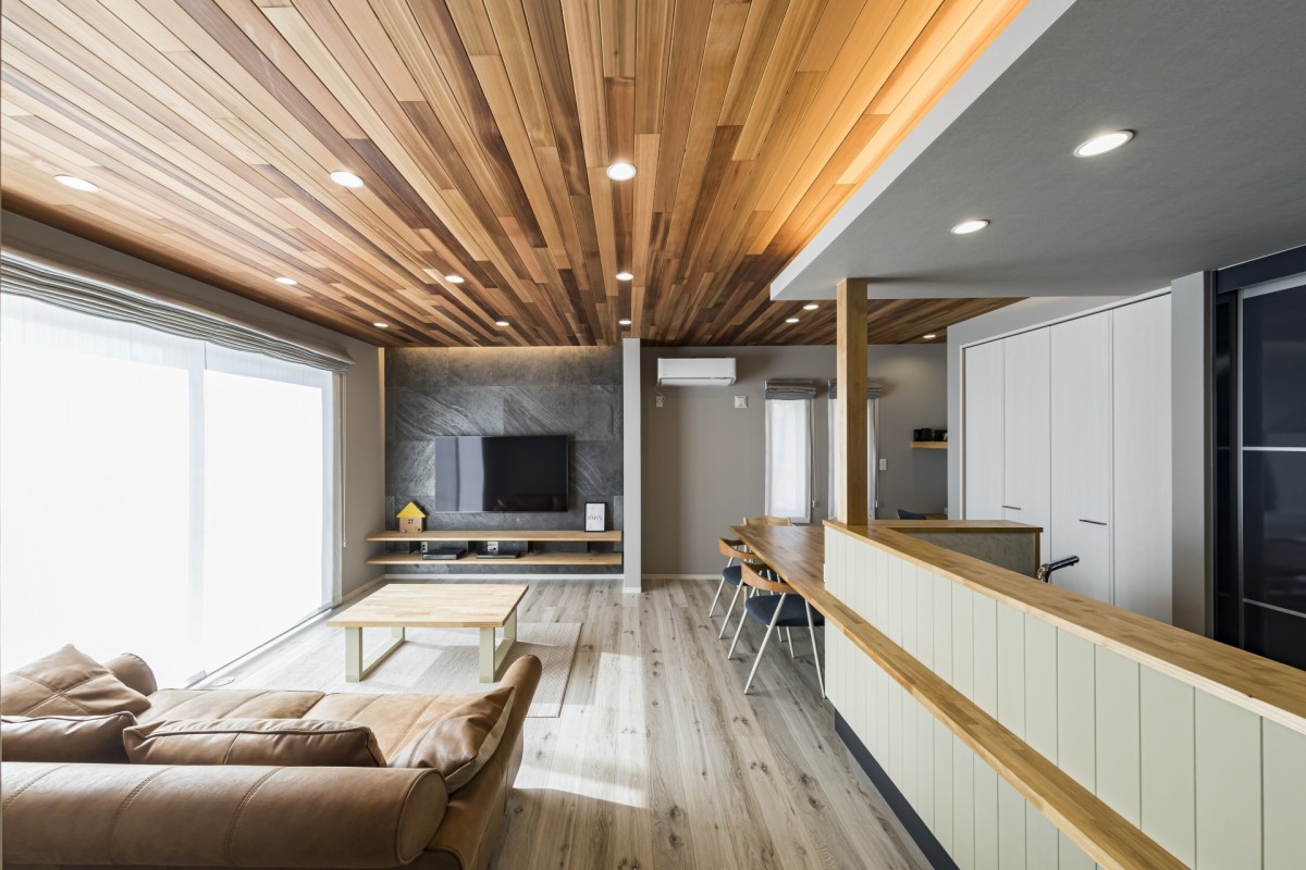 リビングの木天井とキッチン上の段差の天井。造作のダイニングテーブルと収納の多さを要望し、一番要望したのは共働きなので洗濯物を外に干さないので、サンルームを強く希望しました。