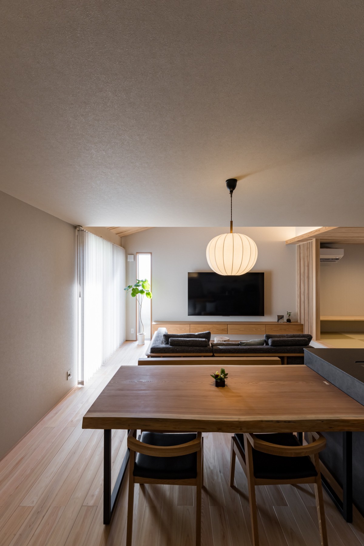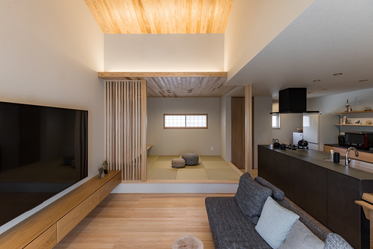 勾配天井で空間に解放感と広がりを与えてくれて、小上がりの和室とたっぷりの木材で温かみのあるリビング