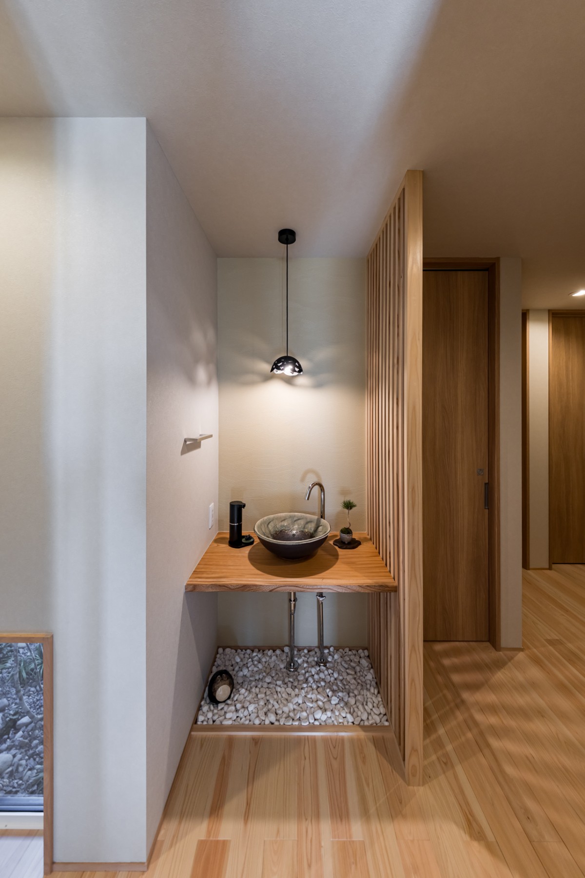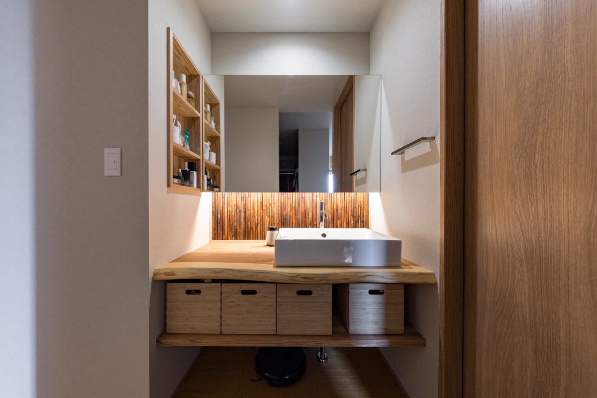 水回りを緩やかに仕切る格子スクリーン。実用性と意匠性を兼ね備えた空間を叶えてくれます
