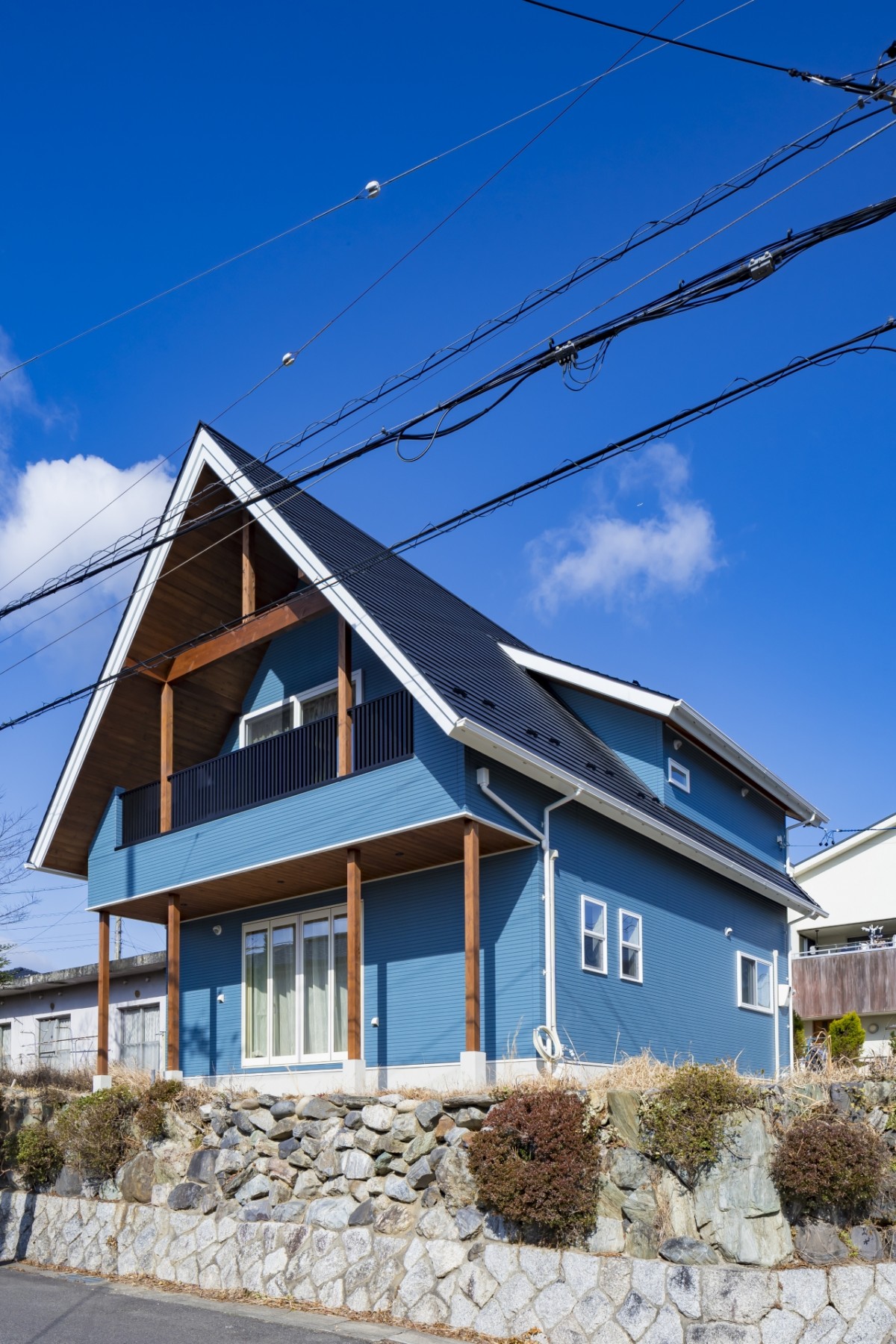 木を感じる柱をのこしつつ欧米風の青い外壁が魅力的な三角屋根のお家。