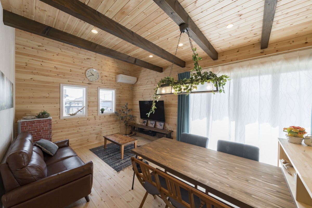 無垢材を使用した温かみのある床に、深い色味のあらわし梁が印象的なリビング。