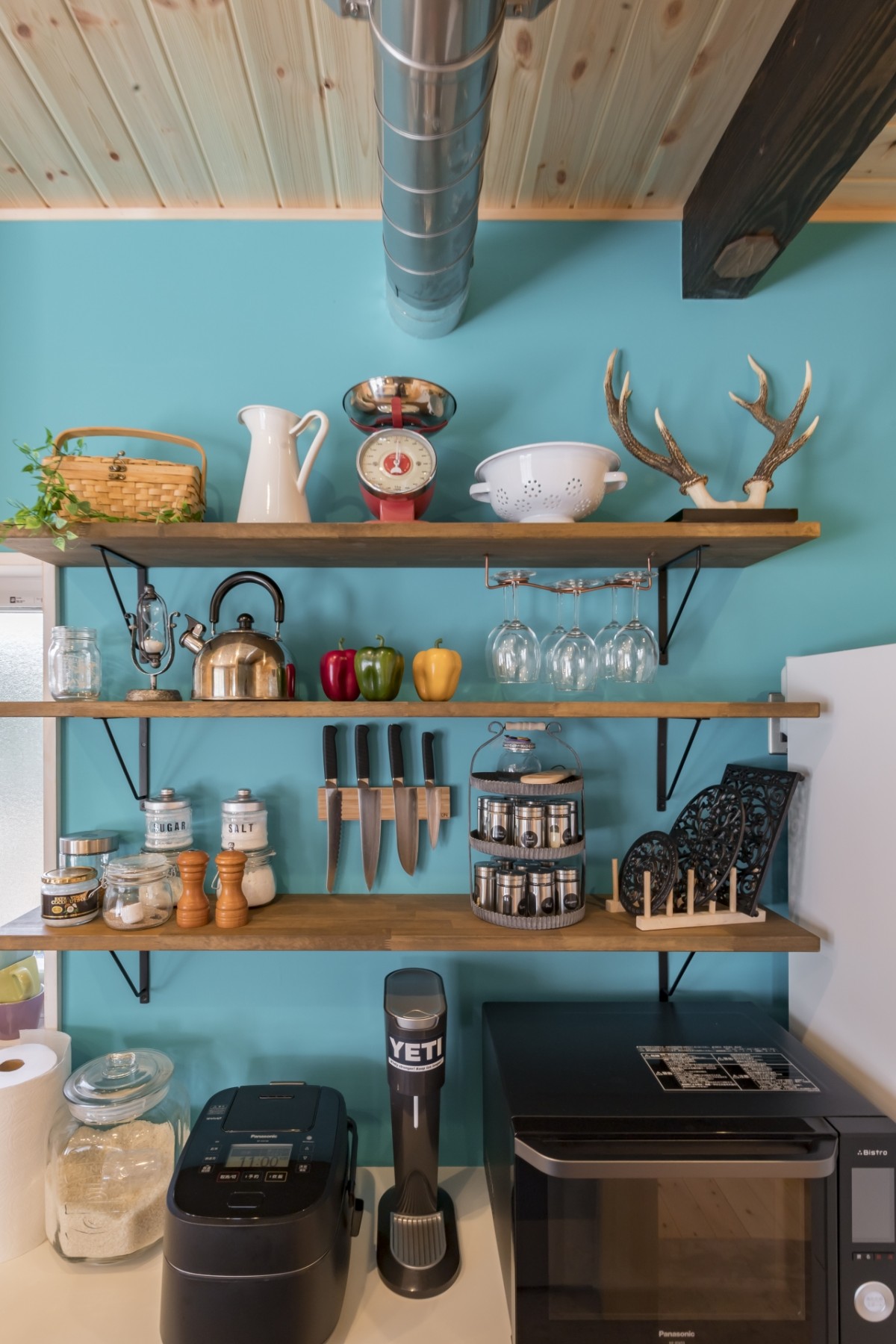 外観に合わせて、青い壁を使用。木を使った棚とカラフルな壁がカフェのようなスペースです。