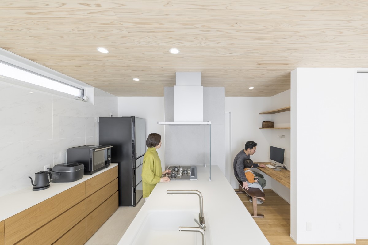 家族で使えるキッチン横のワークスペース、椅子はダイニングと兼用もできます。