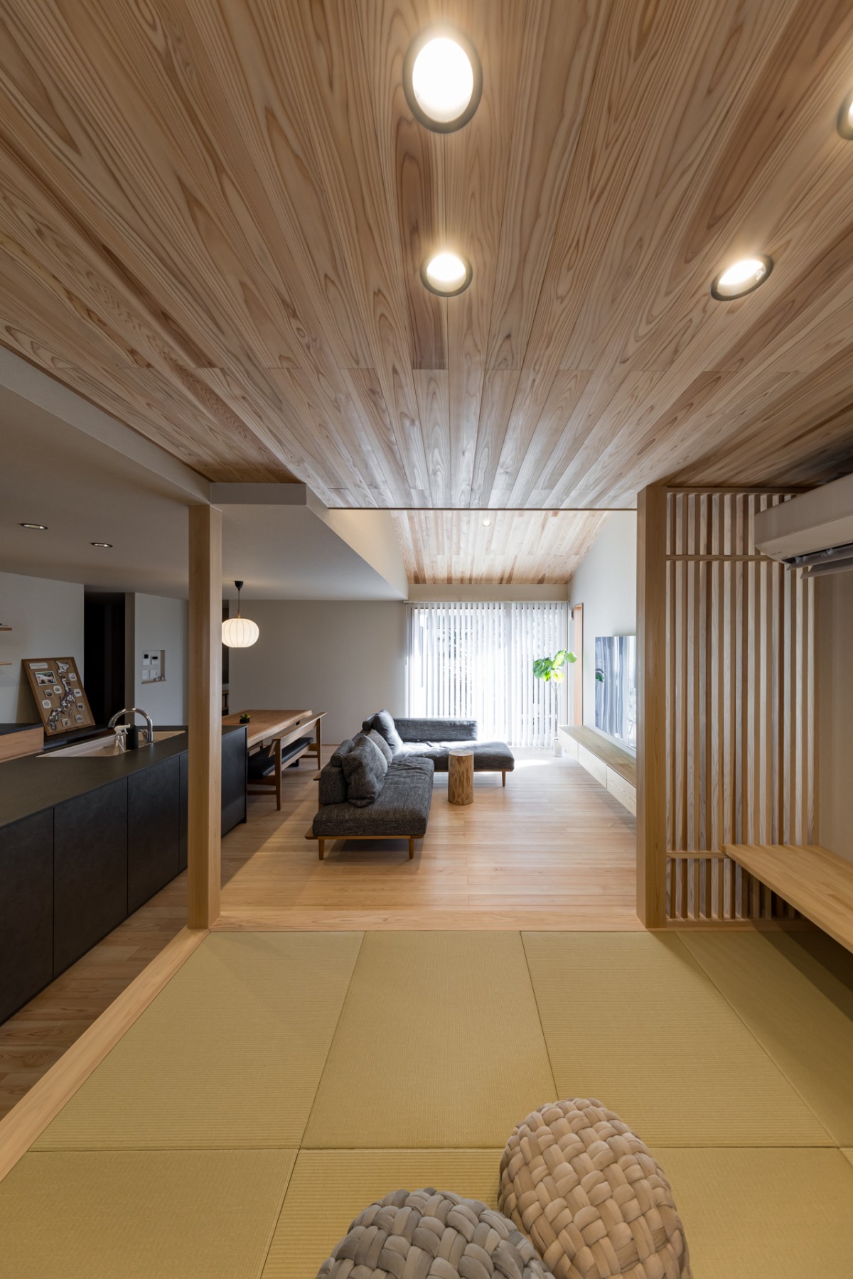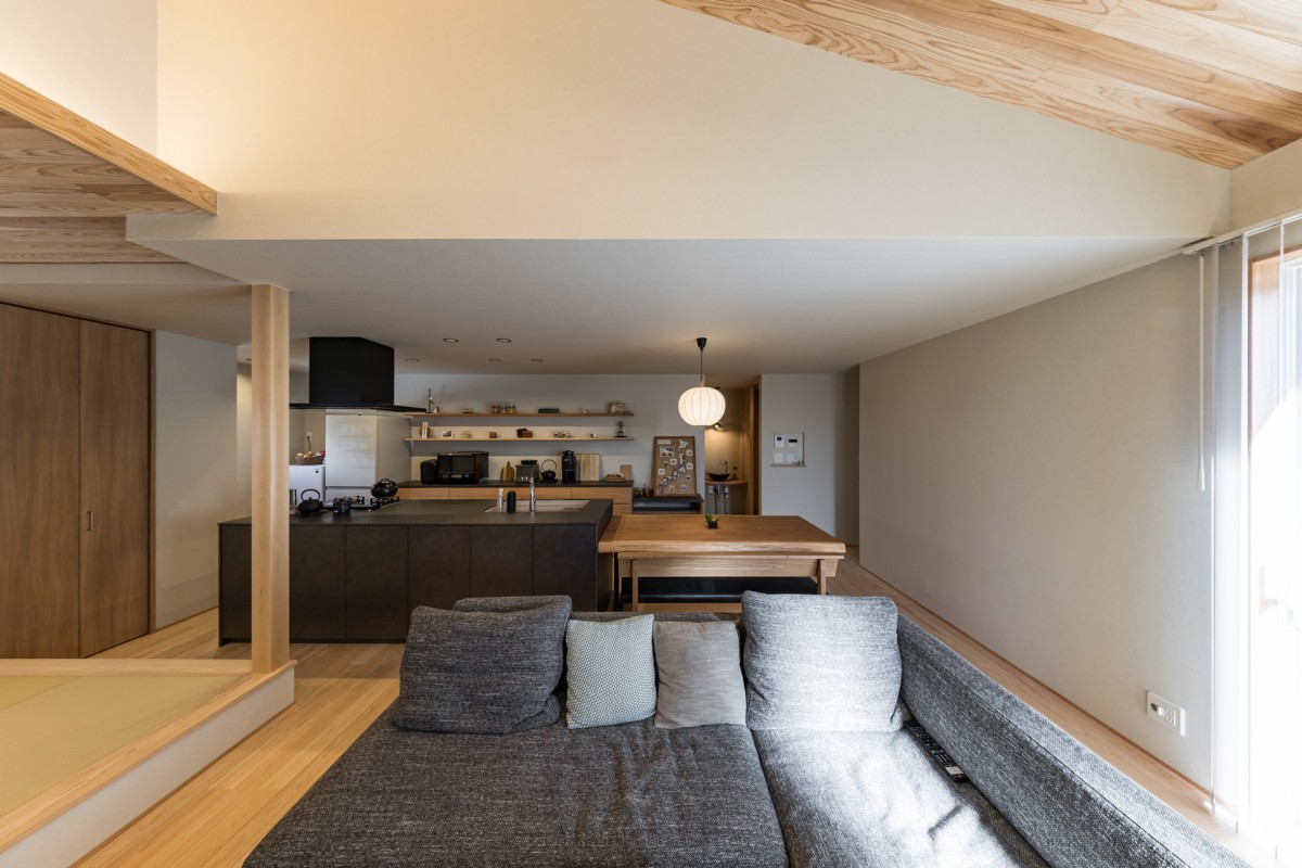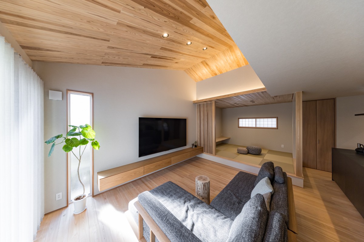 勾配天井で空間に解放感と広がりを与えてくれて、小上がりの和室とたっぷりの木材で温かみのあるリビング